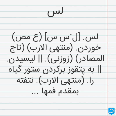 لس. [ل َس س] (ع مص) خوردن. (منتهی الارب) (تاج المصادر) (زوزنی). || لیسیدن. || به پتقوز برکردن ستور گیاه را. (منتهی الارب). نتفته بمقدم فمها فی عباره اخری اخذته ُ باطراف لسانها. (افرب الموارد). گرفتن دابه گیاه به دندان. (زوزنی). خوردن ستور علف را. (منتخب اللغات).