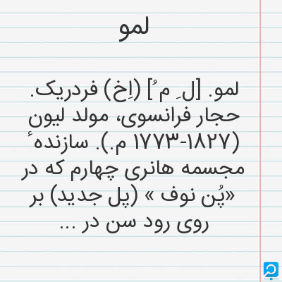 لمو. [ل ِ م ُ] (اِخ) فردریک. حجار فرانسوی، مولد لیون (1773-1827 م.). سازنده ٔ مجسمه هانری چهارم که در «پُن نوف » (پل جدید) بر روی رود سن در پاریس نصب شده است.