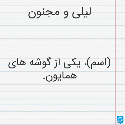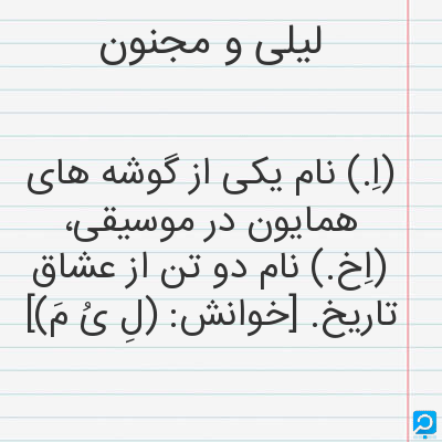 (اِ.) نام یکی از گوشه های همایون در موسیقی، (اِخ.) نام دو تن از عشاق تاریخ. [خوانش: (لِ یُ مَ)]