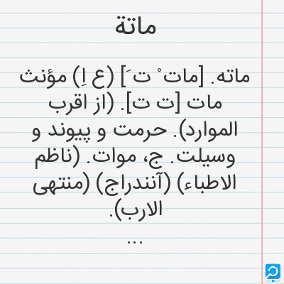 ماته. [مات ْ ت َ] (ع اِ) مؤنث مات [ت ت]. (از اقرب الموارد). حرمت و پیوند و وسیلت. ج، موات. (ناظم الاطباء) (آنندراج) (منتهی الارب).