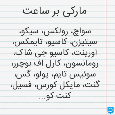 سواچ، رولکس، سیکو، سیتیزن، کاسیو، تایمکس، اورینت، کاسیو جی شاک، رومانسون، کارل اف بوچرر، سوئیس تایم، پولو، گس، گنت، مایکل کورس، فسیل، کنت کول، تیمبرلند، کندال، جیمز مک کیب، ارنشا، اولویا برتون، رویال لندن، ای وی ایت، سرجیو تاچینی، تروساردی، فندی، ورساچه، اگنر، اسکادا، دوفا، فری لوک، ژاک لمن، اسکاگن، کوین واچ