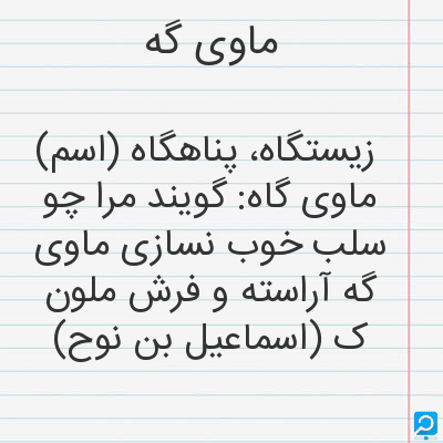 زیستگاه، پناهگاه (اسم) ماوی گاه: گویند مرا چو سلب خوب نسازی ماوی گه آراسته و فرش ملون ک (اسماعیل بن نوح)