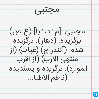 مجتبی. [م ُ ت َ با] (ع ص) برگزیده. (دهار). برگزیده شده. (آنندراج) (غیاث) (از منتهی الارب) (از اقرب الموارد). برگزیده و پسندیده. (ناظم الاطباء). ج، مجتبین و مجتبون. (یادداشت به خط مرحوم دهخدا):