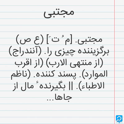 مجتبی. [م ُ ت َ] (ع ص) برگزیننده چیزی را. (آنندراج) (از منتهی الارب) (از اقرب الموارد). پسند کننده. (ناظم الاطباء). || بگیرنده ٔ مال از جاهای آن. (آنندراج) (از منتهی الارب) (از ذیل اقرب الموارد). || جمع کننده و فراهم آورنده. (ناظم الاطباء).