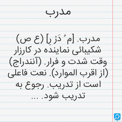 مدرب. [م ُ دَرْ رِ] (ع ص) شکیبائی نماینده در کارزار وقت شدت و فرار. (آنندراج) (از اقرب الموارد). نعت فاعلی است از تدریب. رجوع به تدریب شود. || کسی که درمی آید در زمین دشمنان از بلاد روم. (ناظم الاطباء): ادرب القوم، دخلوا ارض العدو من بلاد الروم. (اقرب الموارد). || رجل مدرب، مرد مجرب. آزماینده. (ناظم الاطباء).