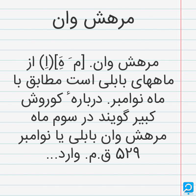 مرهش وان. [م َ هَِ](اِ) از ماههای بابلی است مطابق با ماه نوامبر. درباره ٔ کوروش کبیر گویند در سوم ماه مرهش وان بابلی یا نوامبر 529 ق.م. وارد بابل شد و به شهر مصونیت داد.(از تاریخ ایران باستان پیرنیا ص 388 و 392).