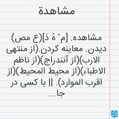 مشاهده. [م ُ هََ دَ](ع مص) دیدن. معاینه کردن.(از منتهی الارب)(از آنندراج)(از ناظم الاطباء)(از محیط المحیط)(از اقرب الموارد). || با کسی در جائی حاضر بودن.(آنندراج). || ادراک به یکی از حواس ظاهری یا باطنی.(از محیط المحیط)(از اقرب الموارد). || نزد اهل سلوک دیدن حق است با دیده ٔ دل و دور از شبهه و تردید بدانسان که با چشم بینند.(از محیط المحیط). بهمه ٔ معانی رجوع به مشاهدت و مشاهده شود.