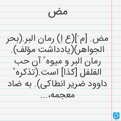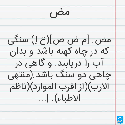مض. [م َض ض](ع اِ) سنگی که در چاه کهنه باشد و بدان آب را دریابند. و گاهی در چاهی دو سنگ باشد.(منتهی الارب)(از اقرب الموارد)(ناظم الاطباء). ||(ص) گرم.(منتهی الارب)(آنندراج)(از ناظم الاطباء)(از اقرب الموارد). || سوزنده: کحل مض، سرمه ٔ چشم سوز.(منتهی الارب)(آنندراج)(از اقرب الموارد)(ناظم الاطباء). || رجل مض الضرب، مرد ضرب دردناک خورده.(منتهی الارب)(آنندراج)(از اقرب الموارد)(ناظم الاطباء).
