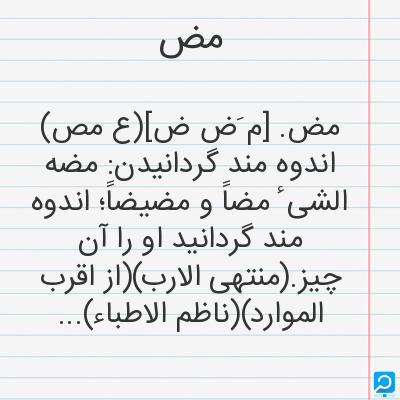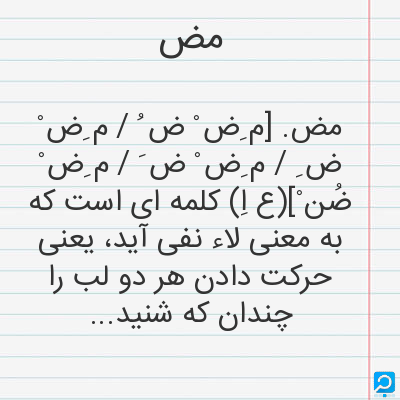 مض. [م ِض ْ ض ُ / م ِض ْ ض ِ / م ِض ْ ض َ / م ِض ْ ضُن ْ](ع اِ) کلمه ای است که به معنی لاء نفی آید، یعنی حرکت دادن هر دو لب را چندان که شنیده شود آوازی که به لای نفی ماند و در آن مطمع اجابت باشد، و فی المثل: ان فی مض لمطمعاً. قال الراجز: سئلتها الوصل فقالت مض.(منتهی الارب)(از اقرب الموارد)(از ناظم الاطباء). و قولهم ما علمک اهلک الا مضاً و بضاً و میضاً و بیضاً؛ یعنی نیاموختند تو را کسان تو جز آنکه چون کسی از تو سئوال کند از دهان آوازی برآری و جواب صحیح از لا و نعم نگوئی.(ناظم الاطباء).