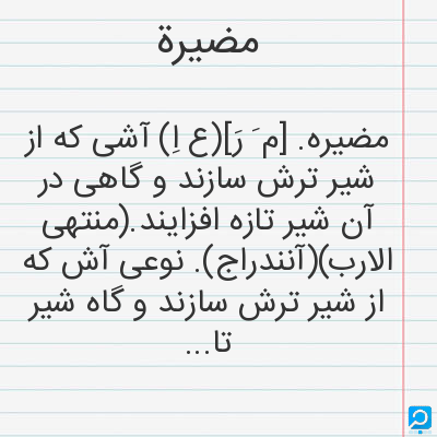 مضیره. [م َ رَ](ع اِ) آشی که از شیر ترش سازند و گاهی در آن شیر تازه افزایند.(منتهی الارب)(آنندراج). نوعی آش که از شیر ترش سازند و گاه شیر تازه بر آن افزایند.(ناظم الاطباء). شیروا.(مهذب الاسماء). دوغبا.(دهار). نام طعامی است که از جغرات برنج سازند.(الفاظ الادویه).
