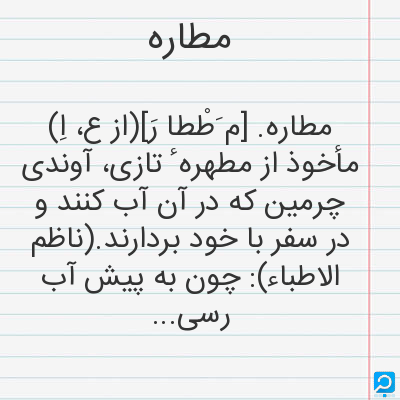 مطاره. [م َطْطا رَ](از ع، اِ) مأخوذ از مطهره ٔ تازی، آوندی چرمین که در آن آب کنند و در سفر با خود بردارند.(ناظم الاطباء): چون به پیش آب رسیدند دست به پشت اسب مالیدند و یک غرفه آب بر گرفتند و در مطاره ریختند.(قصص الانبیاء ص 143). و رجوع به متاره شود.