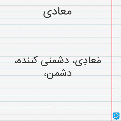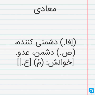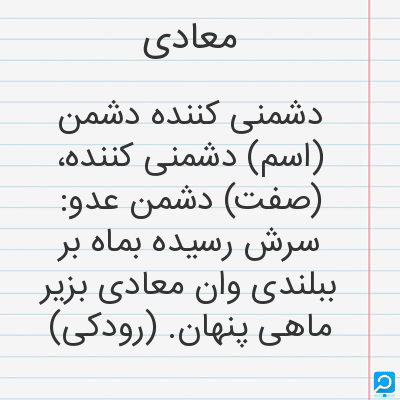 دشمنی کننده دشمن (اسم) دشمنی کننده، (صفت) دشمن عدو: سرش رسیده بماه بر ببلندی وان معادی بزیر ماهی پنهان. (رودکی)
