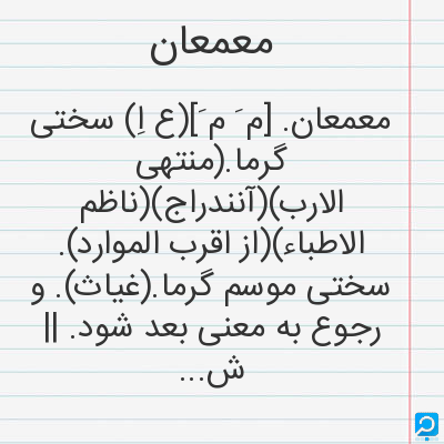 معمعان. [م َ م َ](ع اِ) سختی گرما.(منتهی الارب)(آنندراج)(ناظم الاطباء)(از اقرب الموارد). سختی موسم گرما.(غیاث). و رجوع به معنی بعد شود. || شدت سرما و این لغت از اضداد است. گویند جاء فی معمعان الصیف و فی معمعان الشتاء.(از اقرب الموارد). ||(ص) سخت گرم.(منتهی الارب)(آنندراج). یوم معمعان، روز سخت گرم.(ناظم الاطباء)(از اقرب الموارد).