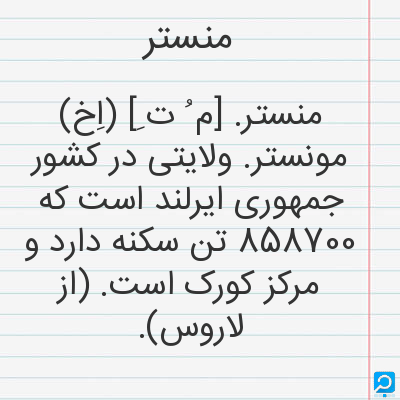 منستر. [م ُ ت ِ] (اِخ) مونستر. ولایتی در کشور جمهوری ایرلند است که 858700 تن سکنه دارد و مرکز کورک است. (از لاروس).