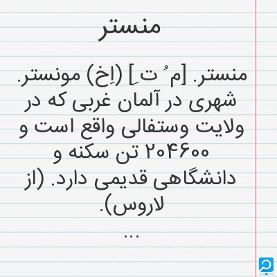 منستر. [م ُ ت ِ] (اِخ) مونستر. شهری در آلمان غربی که در ولایت وستفالی واقع است و 204600 تن سکنه و دانشگاهی قدیمی دارد. (از لاروس).