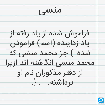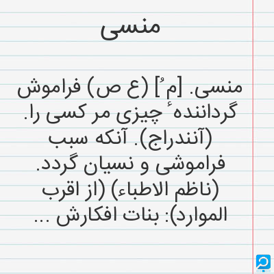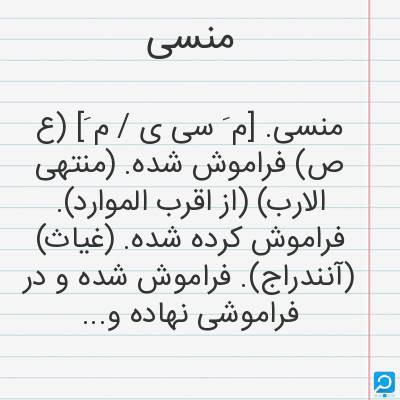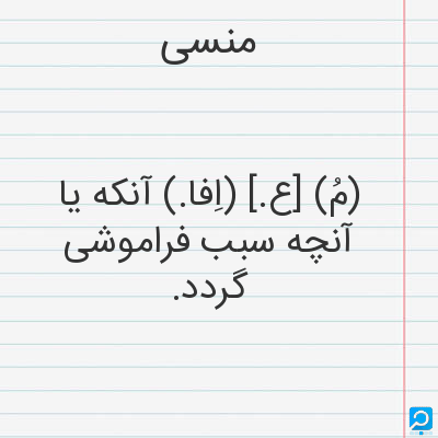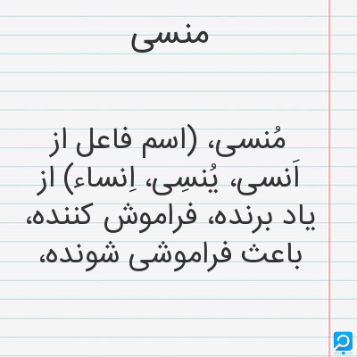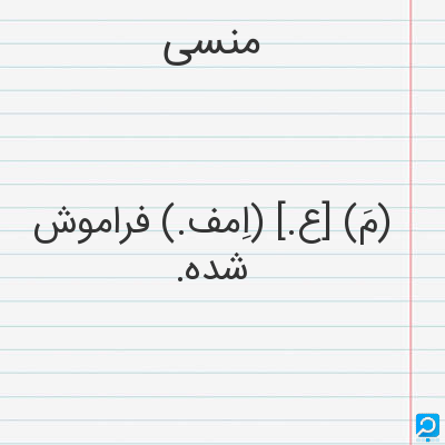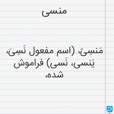 فراموش شده از یاد رفته از یاد زداینده (اسم) فراموش شده: } جز محمد منشی که محمد منسی انگاشته اند ازیرا از دفتر مذکوران نام او برداشته. . . { (نفثه المصدور. چا. یز. 121) (اسم) آنکه یاآنچه سبب فراموشی گردد: } ابیات دویزش ناسخ سخنان سحبان و منسات لطف آمیزش منسی احسان حسان. { (مقدمه دیوان حافظ منسوب بمحمد گلندام. چا. قزوینی. ص ق)