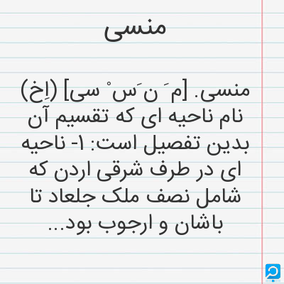 منسی. [م َ ن َس ْ سی] (اِخ) نام ناحیه ای که تقسیم آن بدین تفصیل است: 1- ناحیه ای در طرف شرقی اردن که شامل نصف ملک جلعاد تا باشان و ارجوب بود؛ یعنی از محنایم تا حرمون و از اردن و دریای جلیل تا به دشت سوریه امتداد داشت. 2- ناحیه ای در مغرب اردن که از دریای مدیترانه تا به اردن و از اشیر و یساکار به طرف شمال تا به افرائیم به طرف جنوب امتداد می داشت. (از قاموس کتاب مقدس). رجوع به همین مأخذ و مدخل قبل شود.