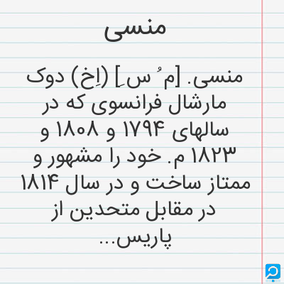 منسی. [م ُ س ِ] (اِخ) دوک مارشال فرانسوی که در سالهای 1794 و 1808 و 1823 م. خود را مشهور و ممتاز ساخت و در سال 1814 در مقابل متحدین از پاریس دفاع کرد (1754-1842م.). (از لاروس).
