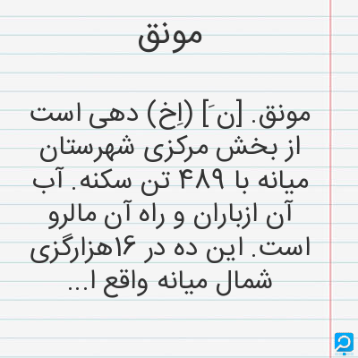 مونق. [ن َ] (اِخ) دهی است از بخش مرکزی شهرستان میانه با 489 تن سکنه. آب آن ازباران و راه آن مالرو است. این ده در 16هزارگزی شمال میانه واقع است. (از فرهنگ جغرافیائی ایران ج 4).