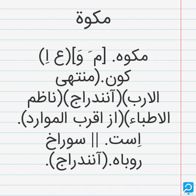 مکوه. [م َ وَ](ع اِ) کون.(منتهی الارب)(آنندراج)(ناظم الاطباء)(از اقرب الموارد). اِست. || سوراخ روباه.(آنندراج).