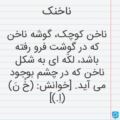 ناخن کوچک، گوشه ناخن که در گوشت فرو رفته باشد، لکّه ای به شکل ناخن که در چشم بوجود می آید. [خوانش: (خُ نَ) (اِ.)]