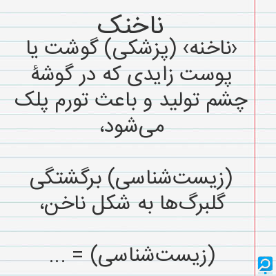 ‹ناخنه› (پزشکی) گوشت یا پوست زایدی که در گوشۀ چشم تولید و باعث تورم پلک میشود،
