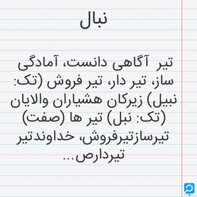 آگاهی دانست، آمادگی تیر ساز، تیر دار، تیر فروش (تک: نبیل) زیرکان هشیاران والایان (تک: نبل) تیر ها (صفت) تیرسازتیرفروش، خداوندتیر تیردارصاحب تیر. (صفت) جمع نبیل. ، جمع نبل.