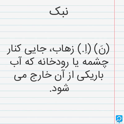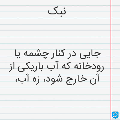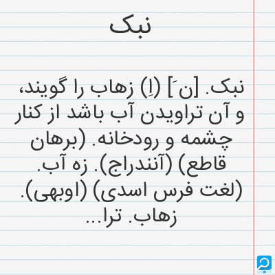 نبک. [ن َ] (اِ) زهاب را گویند، و آن تراویدن آب باشد از کنار چشمه و رودخانه. (برهان قاطع) (آنندراج). زه آب. (لغت فرس اسدی) (اوبهی). زهاب. تراوش آب ازکنار چشمه و رودخانه. (برهان قاطع). بمعنی تراویدن آب بود از کنار چشمه و رودخانه، و آن را به پارسی زهاب نیز گویند، یعنی زایش آب. (انجمن آرا). تراویدن آب بود از کناره ٔ چشمه و رودخانه، و آن را زهاب نیز خوانند. (فرهنگ نظام از جهانگیری). نبک، زه آب [ره آب، مرحوم دهخدا] بود. رودکی سمرقندی گوید: