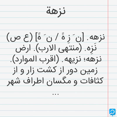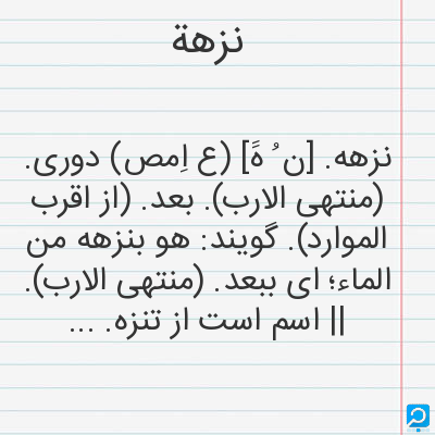 نزهه. [ن ُ هََ] (ع اِمص) دوری. (منتهی الارب). بعد. (از اقرب الموارد). گویند: هو بنزهه من الماء؛ ای ببعد. (منتهی الارب). || اسم است از تنزه. گویند:ارض ذات نزهه. (از اقرب الموارد). ج، نُزَه. || دوری از ناخوشی و پژمانی. (منتهی الارب) (ناظم الاطباء). || دوری از عیب و زشتی. بی عیبی.پاکیزگی. نکوئی. (آنندراج از کشف اللغات و صراح و لطائف و منتخب اللغات). || تفرج و گردش در سبزه زارها و بساتین و باغ ها. (ناظم الاطباء). نزهت.