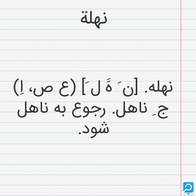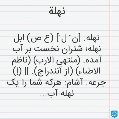 نهله. [ن َ ل َ] (ع ص) ابل نهله؛ شتران نخست بر آب آمده. (منتهی الارب) (ناظم الاطباء) (از آنندراج). || (اِ) جرعه. آشام: هرکه شما را یک نهله آب بخوراند به نام مسیح راست بگویم به شما که ثواب آن کس ضایع نشود. (ترجمه ٔ دیاتسارون ص 142) (یادداشت مؤلف).