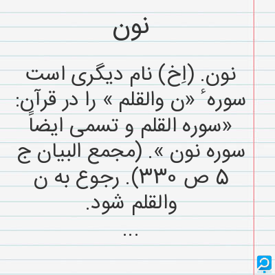 نون. (اِخ) نام دیگری است سوره ٔ «ن والقلم » را در قرآن: «سوره القلم و تسمی ایضاً سوره نون ». (مجمع البیان ج 5 ص 330). رجوع به ن والقلم شود.