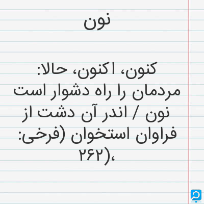 کنون، اکنون، حالا: مردمان را راه دشوار است نون / اندر آن دشت از فراوان استخوان (فرخی: ۲۶۲)،