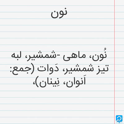 || دوات. (منتهی الارب) (غیاث اللغات) (جهانگیری) (متن اللغه) (اقرب الموارد) (مهذب الاسماء) (ناظم الاطباء) سیاهی دان. (ناظم الاطباء). || سیاهی دوات. (غیاث اللغات). مرکب و سیاهی که در دوات نمایند. (جهانگیری). مرکب. (برهان قاطع). || شب. (غیاث اللغات). || تیزی تیغ. (منتهی الارب). کرانه ٔ شمشیر. (برهان قاطع). کنار تیز شمشیر. (ناظم الاطباء). شفرهالسیف. (متن اللغه) (اقرب الموارد). تیزی شمشیر. (مهذب الاسماء). || شمشیر. (غیاث اللغات) (برهان قاطع) (جهانگیری) (ناظم الاطباء). || نعمت. (منتهی الارب) (آنندراج). دولت. ثروت. بزرگواری. حشمت. نیکبختی. سعادت. (ناظم الاطباء). || نام شمشیری مر بعض عرب را، سمی لکونه علی مثال السمکه. (منتهی الارب). نام شمشیری است معروف. (مهذب الاسماء). || در اصطلاح صوفیه، نون عبارت از علم خدای متعال است در حضرت احدیت و قلم حضرت تفصیل است. (فرهنگ مصطلحات عرفا) نون، هوالعلم الاجمال یرید به الدواه فان الحروف التی هی صورالقلم موجوده فی مدادها اجمالی و فی قوله تعالی: ن و القلم، هوالعلم الاجمال فی الحضره الاحدیه و القلم حضره التفصیل. (تعریفات).
