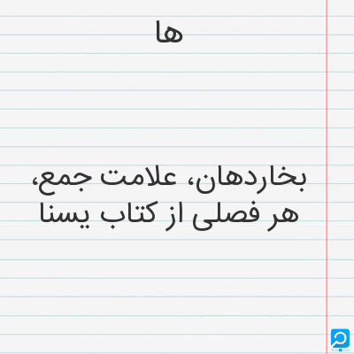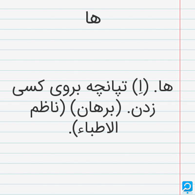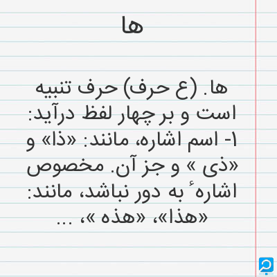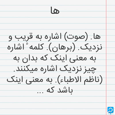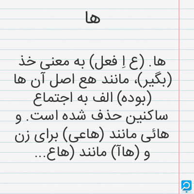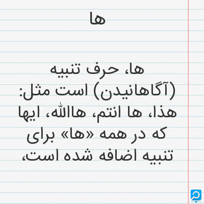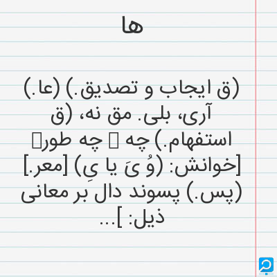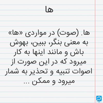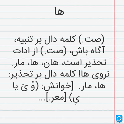 (صت.) کلمه دال بر تنبیه، آگاه باش، (صت.) از ادات تحذیر است، هان، ها، مار. نروی ها! کلمه دال بر تحذیر: ها، مار. [خوانش: (وُ یَ یا یِ) [معر.] (پس.) پسوند دال بر معانی ذیل: ]