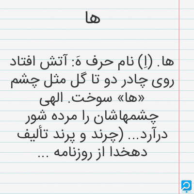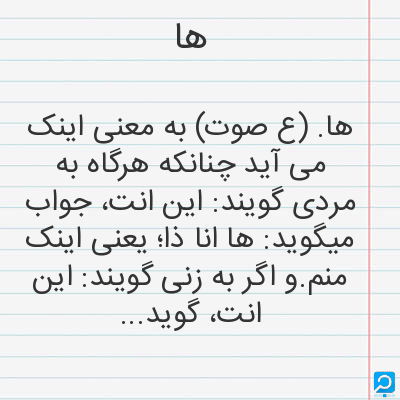ها. (صوت) در مواردی «ها» به معنی بنگر، ببین، بهوش باش و مانند اینها به کار میرود که در این صورت از اصوات تنبیه و تحذیر به شمار میرود و ممکن است مخفف هان باشد، چنانکه صاحب نهج الادب در ذیل حروف تنبیه پس از ذکر هان آرد: «ها چون هادرویش و می تواند که ها بخصوصه مخفف هان بود که هم برای این معنی آید، چنانکه هادوری به معنی گدای مبرم یعنی شخصی که دوری از او بهتر است، در محل تخصیص و آگاه کردن مستعمل شده اولاً بعد از آن به معنی گدای مبرم آمده مجازاً. اثیر اخسیکتی گفته: