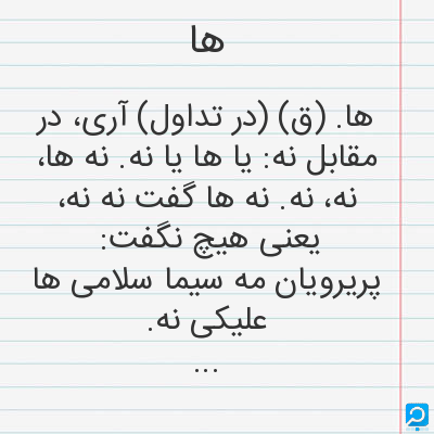 ها. (ق) (در تداول) آری، در مقابل نه: یا ها یا نه. نه ها، نه، نه. نه ها گفت نه نه، یعنی هیچ نگفت: