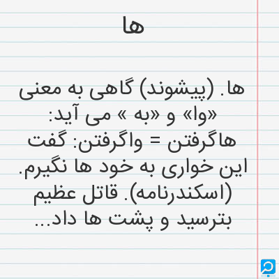 ها. (پیشوند) گاهی به معنی «وا» و «به » می آید: هاگرفتن = واگرفتن: گفت این خواری به خود ها نگیرم. (اسکندرنامه). قاتل عظیم بترسید و پشت ها داد. (اسکندرنامه). گفت برو بپرس که طفغاچ کدام است و دست او هاگیر. (اسکندرنامه).