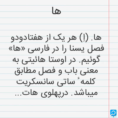 ها. (اِ) هر یک از هفتادودو فصل یسنا را در فارسی «ها» گوئیم. در اوستا هائیتی به معنی باب و فصل مطابق کلمه ٔ ساتی سانسکریت میباشد. درپهلوی هات گفته اند. اصلاًاین کلمه به معنی پیوند و بستگی است، مشتق از فعل ها که به معنی بهم پیوستن و بستن است، در سانسکریت سیاتی. در هر جا که کلمه ٔ «ها» آمده از آن فصل یسنا اراده کرده اند، چنانکه کلمه ٔ «کرده » از برای تعیین فصل «وسپرد» و «فرگرد» از برای تعیین فصل «وندیداد» اختصاص یافته است. کلمه ٔ «ها» بخصوص به هر یک از هفده فصل گاتها که جزو یسناست اطلاق میشود. در انجام هر یک از هفده فصل منظوم گاتها به نثر افزوده شده: اهیاس ها میستائیم. خشماویه گئوش اُوروهار میستائیم... (یسنا پورداود ج 1 صص 25-26).