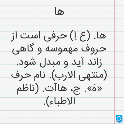 ها. (ع اِ) حرفی است از حروف مهموسه و گاهی زائد آید و مبدل شود. (منتهی الارب). نام حرف «هَ». ج، هاآت. (ناظم الاطباء).