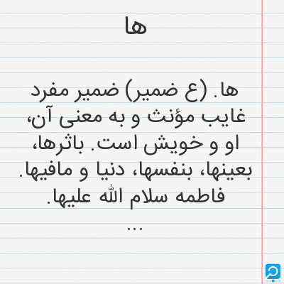 ها. (ع ضمیر) ضمیر مفرد غایب مؤنث و به معنی آن، او و خویش است. باثرها، بعینها، بنفسها، دنیا و مافیها. فاطمه سلام اﷲ علیها.