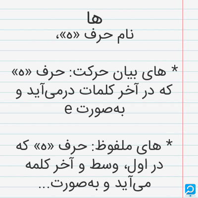 * های ملفوظ: حرف «ه» که در اول، وسط و آخر کلمه میآید و بهصورت h