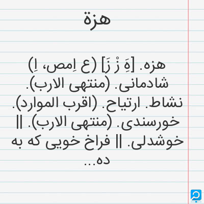 هزه. [هَِ زْ زَ] (ع اِمص، اِ) شادمانی. (منتهی الارب). نشاط. ارتیاح. (اقرب الموارد). خورسندی. (منتهی الارب). || خوشدلی. || فراخ خویی که به دهش پیدا گردد. (منتهی الارب). || تردد بانگ تندر. || آواز جوشش دیگ. || نوعی از رفتار شتر. (منتهی الارب) (اقرب الموارد). رجوع به هزت شود.