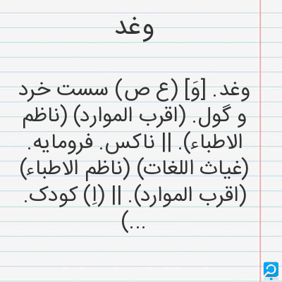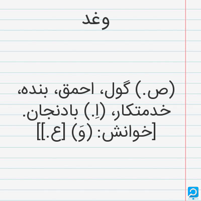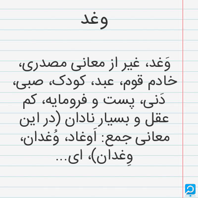 وغد. [وَ] (ع ص) سست خرد و گول. (اقرب الموارد) (ناظم الاطباء). || ناکس. فرومایه. (غیاث اللغات) (ناظم الاطباء) (اقرب الموارد). || (اِ) کودک. (ناظم الاطباء) (اقرب الموارد). || خدمتگزار قوم. (اقرب الموارد). || کمینه. (غیاث اللغات). || بنده. (ناظم الاطباء). نوکر و خدمتگزار و آنکه به خوراک شکم خدمت میکند. (ناظم الاطباء) (اقرب الموارد). ج، اوغاد. وُغدان. || یکی از تیرهای قمار که بهره ندارد. قماری که بهره ندارد. (ناظم الاطباء) (اقرب الموارد). || شکار. (اقرب الموارد). || بادنجان را گویند و از آن قلیه پزند. (برهان) (اقرب الموارد) (ناظم الاطباء). || (مص) خدمت کردن. (برهان) (اقرب الموارد) (تاج المصادر بیهقی) (آنندراج). || سست خرد و فرومایه و پست شدن. (اقرب الموارد).