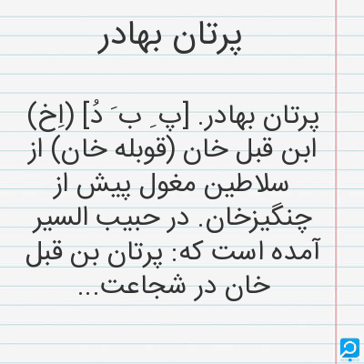 پرتان بهادر. [پ ِ ب َ دُ] (اِخ) ابن قبل خان (قوبله خان) از سلاطین مغول پیش از چنگیزخان. در حبیب السیر آمده است که: پرتان بن قبل خان در شجاعت و مردانگی در زمان خود عدیل نداشت بنابر آن لقب خانی او به بهادری تبدیل یافت و در ایام دولت پرتان عمش قاجولی بهادر بمرد پرتان منصب سرداری سپاه را به پسرش ایردمجی تفویض کرد بعد از آن ایردمجی را برلاس گفتند و نسب تمامی برلاس به وی اتصال می یابد و پرتان بهادر را فرزندان بسیار بود از آن جمله ییسیوکا بهادربمزید مردانگی و تهور امتیاز داشت لاجرم بعد از فوت پدر علم کامرانی برافراشت. رجوع به حبط ج 2 ص 6 شود.