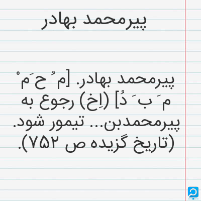 پیرمحمد بهادر. [م ُ ح َم ْ م َ ب َ دُ] (اِخ) رجوع به پیرمحمدبن... تیمور شود. (تاریخ گزیده ص 752).