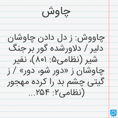چاووش: ز دل دادن چاوشان دلیر / دلاورشده گور بر جنگ شیر (نظامی۵: ۸۰۱)، نفیر چاوشان ز «دور شو، دور» / ز گیتی چشم بد را کرده مهجور (نظامی۲: ۲۵۴)،