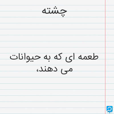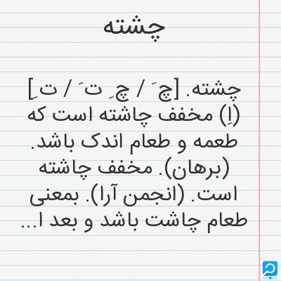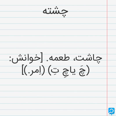چشته. [چ َ / چ ِ ت َ / ت ِ] (اِ) مخفف چاشته است که طعمه و طعام اندک باشد. (برهان). مخفف چاشته است. (انجمن آرا). بمعنی طعام چاشت باشد و بعد از آن تخفیف نموده بمعنی مأخوذ استعمال کرده باشند. (آنندراج). طعام اندک و طعمه و چاشت. (ناظم الاطباء). غذایی که به حیوانات به خصوص درندگان میدهند، که درتکلم طعمه است. (فرهنگ نظام). طعمه. نواله: و چون سلیمان به اسد رسید مصاف داده همی آمدند تا بساری دیالم و سادات چون شیر که به چشته رود پیشباز شدند و بسیاری را کشته و هزیمت کرده... (تاریخ طبرستان). رجوع به چشته خوار و چشته خور شود. || چاشنی و مزه. (ناظم الاطباء). || مسته. کریز. کمی از گوشت که بمرغان شکاری دهند تا آنانرا حریص بشکار کنند. گوشتی از صید باز که خود باز را دهند. || گوشت یا چربی یا خوردنی دیگری که بقلاب ماهیگیری بندند تا ماهی را بدان وسیله صید کنند. فریه. || تخم مرغی که در لانه ٔ مرغ یا جای دیگر میگذارند که مرغ همواره بدانجا رفته تخم بگذارد. رومَه. (در اصطلاح اهالی فیض آباد محولات بخش تربت حیدریه). || آنکه معاش خود را بدون زحمت تحصیل میکند. (ناظم الاطباء). چشته خور. چشته خوار.
