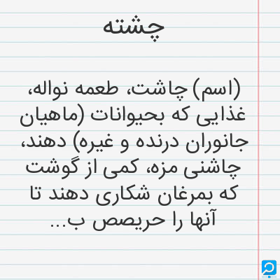 (اسم) چاشت، طعمه نواله، غذایی که بحیوانات (ماهیان جانوران درنده و غیره) دهند، چاشنی مزه، کمی از گوشت که بمرغان شکاری دهند تا آنها را حریصص بشکار کنند.