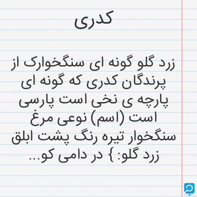 زرد گلو گونه ای سنگخوارک از پرندگان کدری که گونه ای پارچه ی نخی است پارسی است (اسم) نوعی مرغ سنگخوار تیره رنگ پشت ابلق زرد گلو: } در دامی کوه کبک شبگیران در رفت بهم برقص با کدری . { (منوچهری) (اسم) نوعی پارچه نخی.