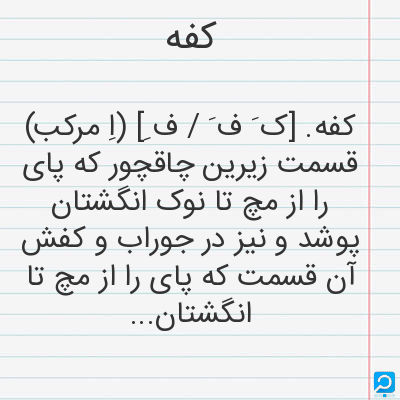 کفه. [ک َ ف َ / ف ِ] (اِ مرکب) قسمت زیرین چاقچور که پای را از مچ تا نوک انگشتان پوشد و نیز در جوراب و کفش آن قسمت که پای را از مچ تا انگشتان در بر می گیرد. (از یادداشتهای مرحوم دهخدا).